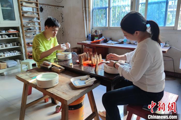 張才枝的兩個徒弟在學(xué)習(xí)制筆?!枪跇?攝