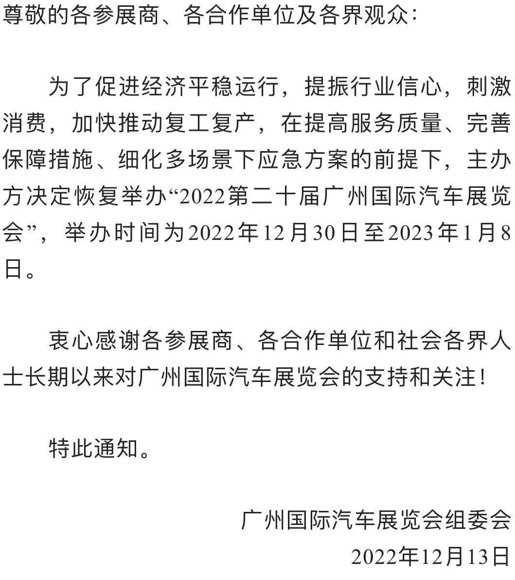 中新網(wǎng)12月13日電 據(jù)“廣州國際汽車展”公眾號消息,廣州國際汽車展覽會組委會12月13日發(fā)布通知,為了促進經(jīng)濟平穩(wěn)運行,提振行業(yè)信心,刺激消費,加快推動復(fù)工復(fù)產(chǎn),在提高服務(wù)質(zhì)量、完善保障措施、細化多場景下應(yīng)急方案的前提下,主辦方?jīng)Q定恢復(fù)舉辦“2022第二十屆廣州國際汽車展覽會”,舉辦時間為2022年12月30日至2023年1月8日。(中新財經(jīng))