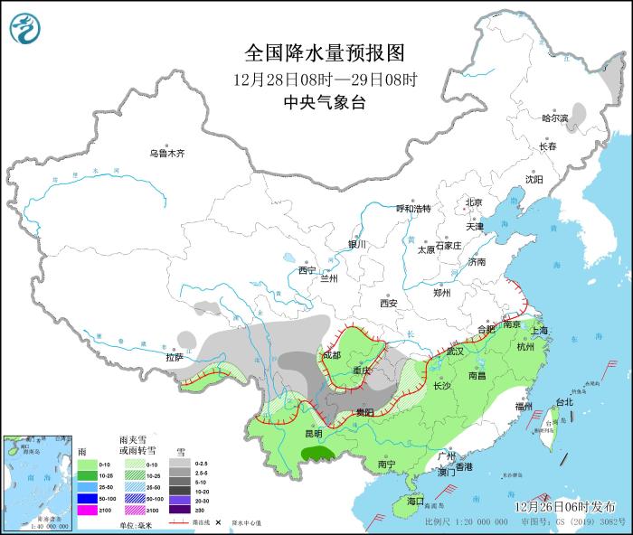 12月28日08時(shí)至29日08時(shí),黑龍江東部、西藏東部和南部、湖北南部、川西高原、重慶東南部、貴州大部、湖南西部、云南北部以及安徽大別山區(qū)等地部分地區(qū)有小到中雪或雨夾雪。江淮南部、江南大部、西南地區(qū)東南部、華南大部等地部分地區(qū)有小到中雨。內(nèi)蒙古中部、河北北部部分地區(qū)有4~5級(jí)風(fēng)。東海南部海域、臺(tái)灣海峽、巴士海峽、南海大部海域、北部灣將有6~7級(jí)、陣風(fēng)8級(jí)的偏北或東北風(fēng),其中臺(tái)灣海峽、南海東北部的部分海域風(fēng)力可達(dá)8級(jí)、陣風(fēng)9級(jí)(見圖3)。