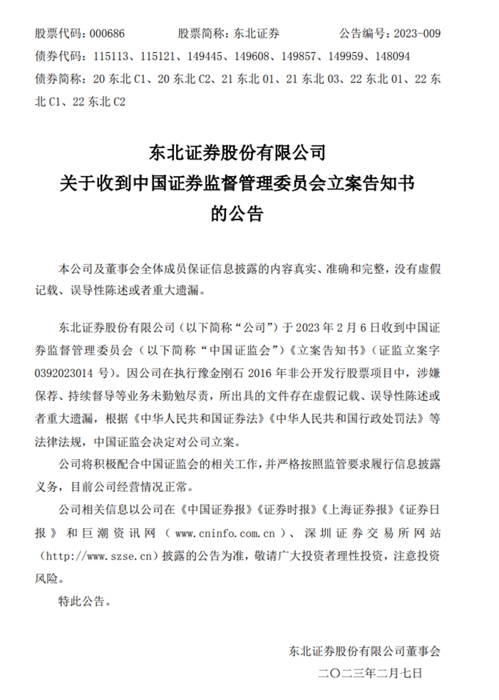中新網(wǎng)2月7日電 7日,東北證券發(fā)公告稱,東北證券股份有限公司于2023年2月6日收到中國證券監(jiān)督管理委員會《立案告知書》(證監(jiān)立案字 0392023014 號)。因公司在執(zhí)行豫金剛石2016年非公開發(fā)行股票項目中,涉嫌保薦、持續(xù)督導(dǎo)等業(yè)務(wù)未勤勉盡責(zé),所出具的文件存在虛假記載、誤導(dǎo)性陳述或者重大遺漏,根據(jù)相關(guān)法律法規(guī),中國證監(jiān)會決定對公司立案。(中新財經(jīng))
