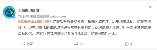 北京市地震局:近期發(fā)生4級以上地震可能性不大
