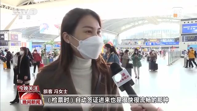 旅客 馮女士:現(xiàn)在方便了很多,檢票時(shí)自動(dòng)簽證進(jìn)來(lái)也是很快很流暢的那種,直接拿身份證刷一下就馬上進(jìn)來(lái)了,以前還要排很長(zhǎng)的隊(duì)現(xiàn)在不用了,很方便。