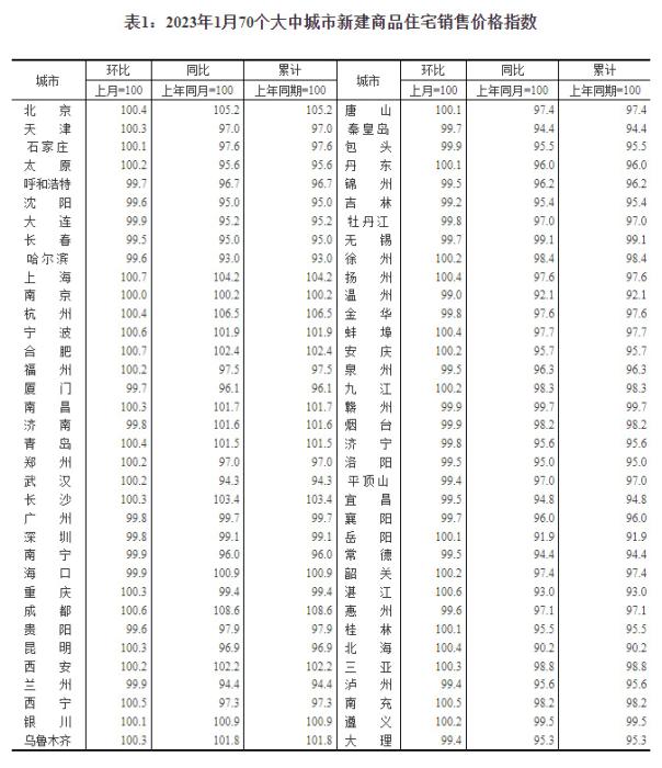 2023年1月份,70個大中城市中商品住宅銷售價格環(huán)比上漲城市個數(shù)增加;一線城市商品住宅銷售價格環(huán)比轉(zhuǎn)漲、二三線城市環(huán)比降勢趨緩,一線城市商品住宅銷售價格同比上漲、二三線城市同比下降。