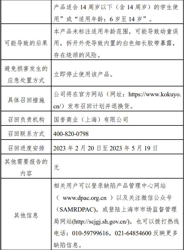 國(guó)譽(yù)商業(yè)(上海)有限公司將在官方網(wǎng)站(網(wǎng)址:https://www.kokuyo.cn/)發(fā)布召回計(jì)劃并退換貨。(中新財(cái)經(jīng))