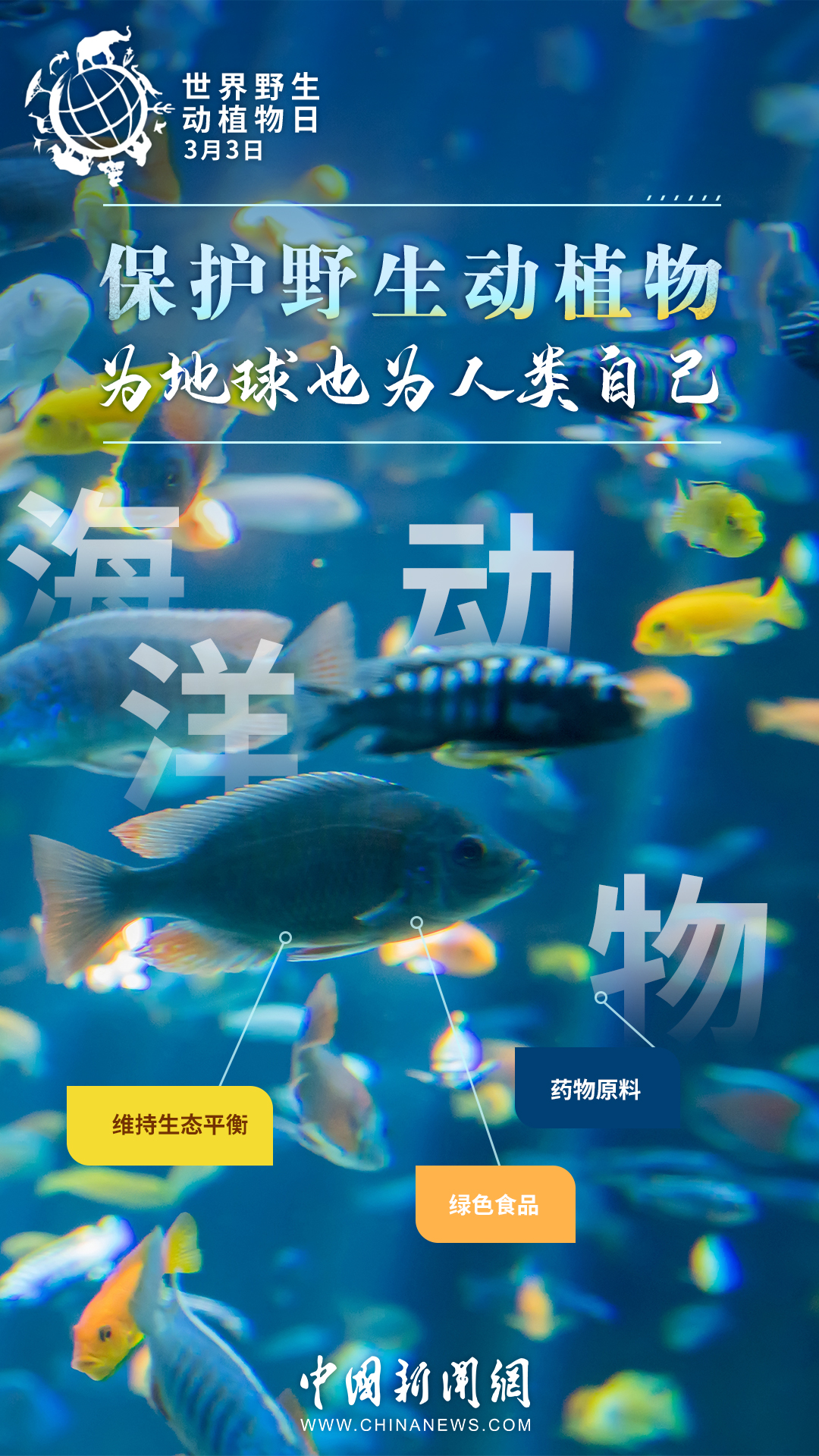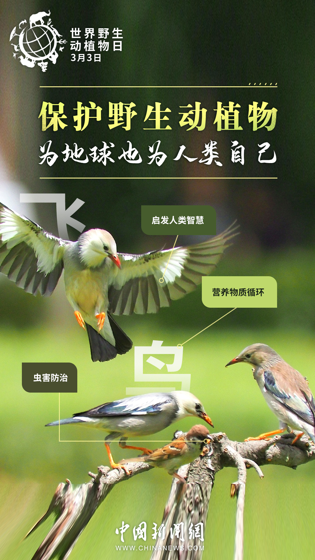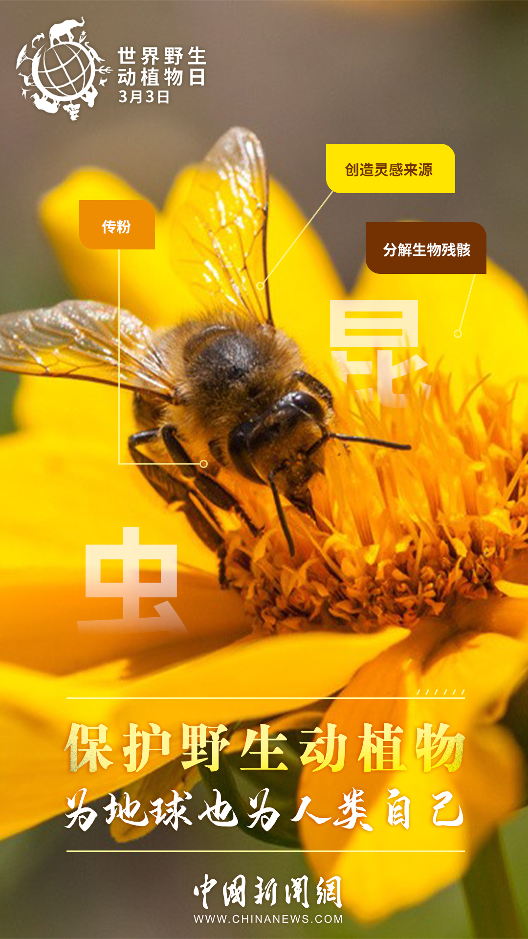 世界約80%的農(nóng)作物都依賴蜜蜂等蟲媒傳粉,一座鯨的尸體可以供養(yǎng)一套以分解者為主的循環(huán)系統(tǒng)長達(dá)百年……其實(shí),大自然里的每種生物都有它存在的價(jià)值。今天是第十個(gè)“世界野生動(dòng)植物日”,戳圖了解它們的作用,一起來保護(hù)野生動(dòng)植物。