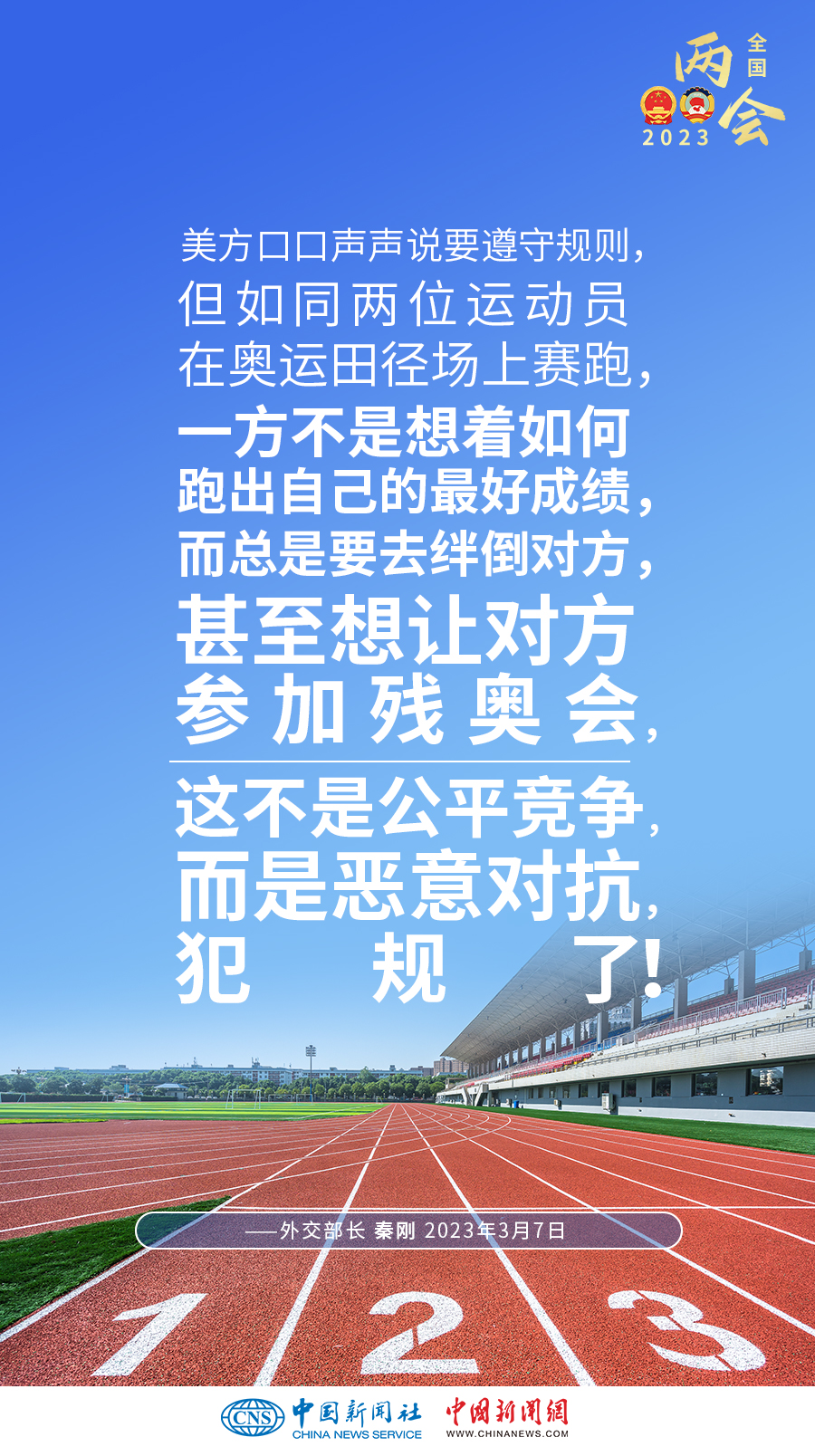 秦剛:美方聲稱要“競贏”中國但不尋求沖突。但實(shí)際上,美方的所謂“競爭”,就是全方位遏制打壓,就是你死我活的零和博弈。美方口口聲聲說要遵守規(guī)則,但如同兩位運(yùn)動員在奧運(yùn)田徑場上賽跑,一方不是想著如何跑出自己的最好成績,而總是要去絆倒對方,甚至想讓對方參加殘奧會,這不是公平競爭,而是惡意對抗,犯規(guī)了!美方所謂要給中美關(guān)系“加裝護(hù)欄”“不沖突”,實(shí)際上就是要中國打不還手,罵不還口,但這辦不到!