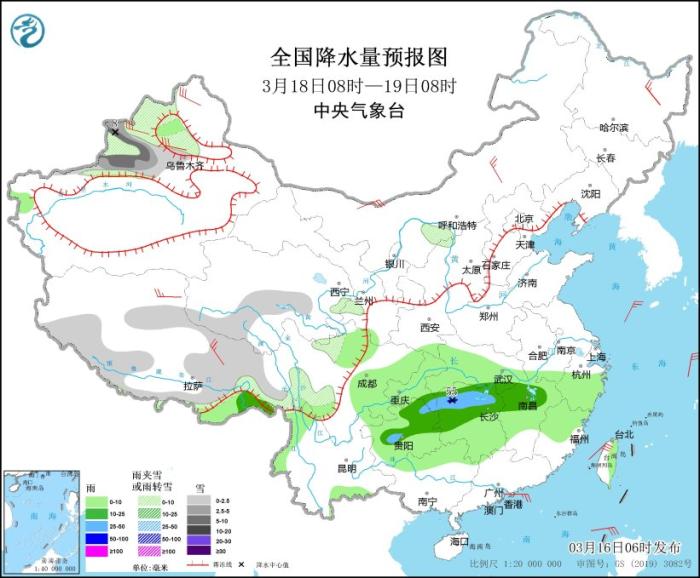 3月18日08時至19日08時,新疆沿天山地區(qū)和西北部、西藏東部和南部、青海中部和南部等地部分地區(qū)有小到中雪或雨夾雪,其中,新疆沿天山地區(qū)等地局地有大雪(5~8毫米)。西藏東南部、貴州中部和東北部、重慶東南部、湖南中北部、湖北東南部、江西北部等地部分地區(qū)有中到大雨,局地暴雨(50~55毫米)。內(nèi)蒙古中部、黑龍江東北部、新疆北部、西藏中部等地部分地區(qū)有4~6級風。臺灣海峽將有6~7級、陣風8級的東北風。