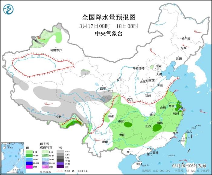 3月16日08時至17日08時,新疆沿天山地區(qū)和伊犁河谷、西藏東部和南部、青海東部和南部、川西高原等地部分地區(qū)有小到中雪或雨夾雪,局地有大雪(5~7毫米)。黃淮西部、江淮西部、江漢、江南北部和西部、西南地區(qū)東部等地部分地區(qū)有中到大雨,其中,貴州東部、湖南北部等地局地有暴雨(50~80毫米)。內(nèi)蒙古中東部、東北地區(qū)、浙江北部等地部分地區(qū)有4~6級風。