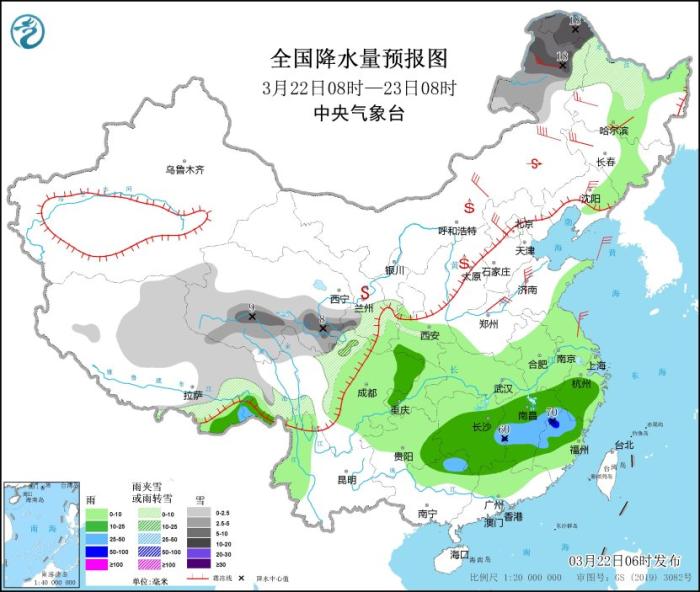 3月23日08時(shí)至24日08時(shí),黑龍江西北部、新疆南疆山區(qū)、西藏東部、青海西部和南部、甘肅南部、川西高原北部等地的部分地區(qū)有小雪或雨夾雪。江南中南部、貴州東南部、華南北部等地的部分地區(qū)有中到大雨,其中,湖南南部、江西中南部、浙江南部、福建北部、廣西東北部、廣東西北部等地的部分地區(qū)有暴雨或大暴雨(100~120毫米)。內(nèi)蒙古東部、黑龍江大部、吉林西部、遼寧大部、山東半島、浙江東部等地部分地區(qū)有4~6級風(fēng)。渤海、渤海海峽、黃海大部海域?qū)⒂?~7級風(fēng)、陣風(fēng)8級。