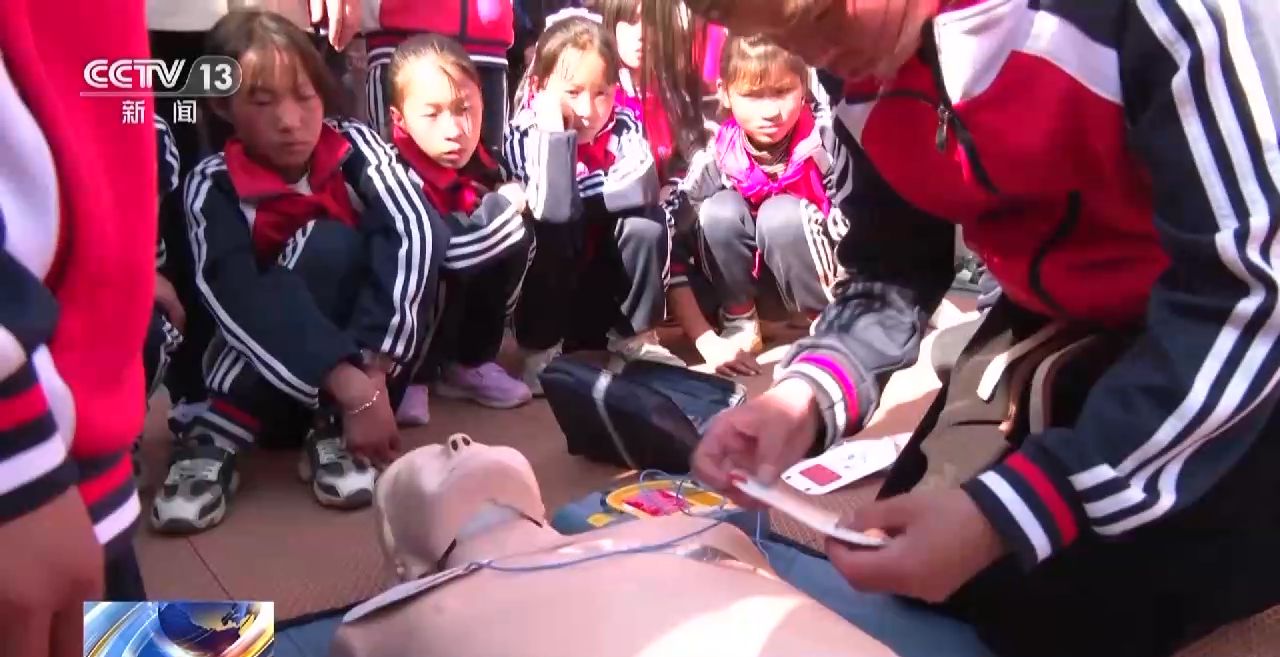 在云南省昭通市魯?shù)榭h鵲落小學,一場“紅氣球校園挑戰(zhàn)賽”將趣味運動會和急救知識答題與實際操作相結合。操場上,同學們在緊張有趣的比賽中不僅得到了運動鍛煉,還在紅十字會專業(yè)救護人員的指導下,體驗海姆立克急救法、心肺復蘇以及AED(自動體外除顫儀)的使用方法,學習創(chuàng)傷包扎等急救知識和技能。