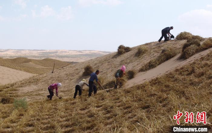 白芨灘林場(chǎng)員工扎麥草方格進(jìn)行治沙(資料圖)?!幭撵`武白芨灘國家級(jí)自然保護(hù)區(qū)管理局供圖