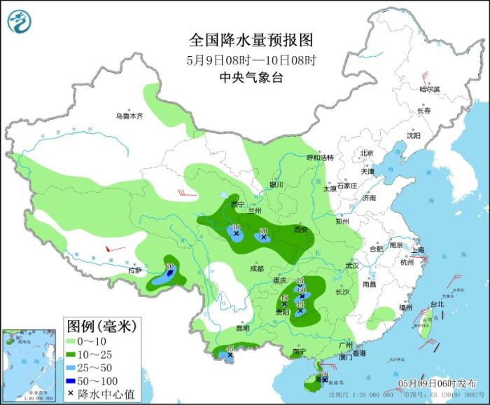 全國降水量預(yù)報(bào)圖(5月9日08時-10日08時)