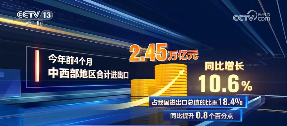 央視網(wǎng)消息:從我國外貿(mào)區(qū)域結(jié)構(gòu)來看,今年前4個月,中西部地區(qū)合計進(jìn)出口2.45萬億元,同比增長10.6%,占我國進(jìn)出口總值的比重18.4%,同比提升0.8個百分點。我國中西部地區(qū)進(jìn)出口快速增長,增速高出全國4.8個百分點。