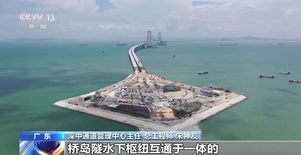 深中通道管理中心主任、總工程師 宋神友:未來,珠江西岸的人跟深圳機場以及前海實現(xiàn)快速交通轉(zhuǎn)換,就是通過在東岸設(shè)置了一個高速公路水下樞紐互通立交的形式,所以最終這個項目就是采用了橋島隧水下樞紐互通于一體的跨海集群工程。