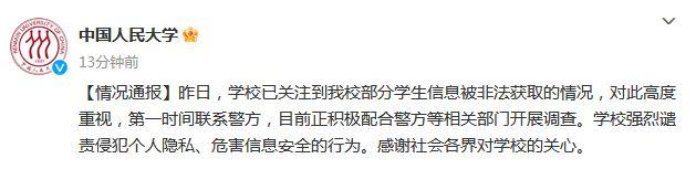 部分學(xué)生信息被非法獲取 中國人民大學(xué):正配合警方開展調(diào)查