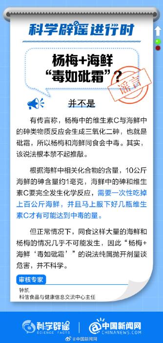 中新網7月14日電 有傳言稱,楊梅中的維生素C與海鮮中的砷類物質反應會生成三氧化二砷,也就是砒霜。這個說法科學嗎?戳圖片了解真相↓(來源:科學辟謠、中國新聞網微博)