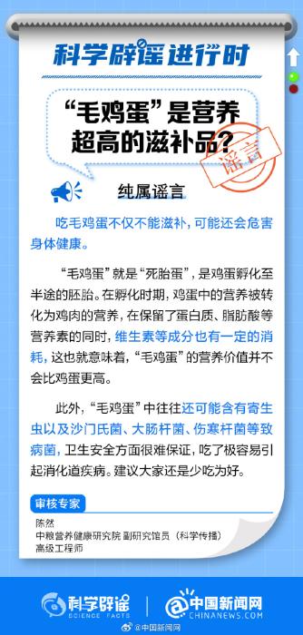 純屬謠言!“毛雞蛋”就是“死胎蛋”,是雞蛋孵化至半途的胚胎?!懊u蛋”的營(yíng)養(yǎng)價(jià)值并不比雞蛋更高,其中還可能含有寄生蟲以及沙門氏菌、大腸桿菌、傷寒桿菌等致病菌,衛(wèi)生安全很難保證,吃了極容易引起消化道疾病。(來源:科學(xué)辟謠、中國新聞網(wǎng)微博)