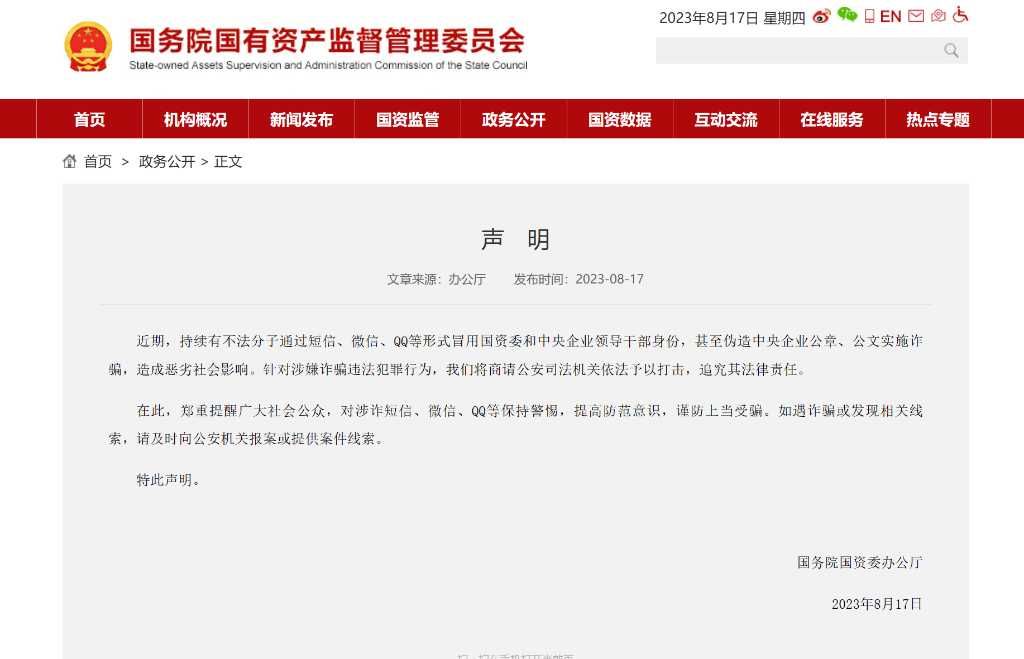 國務(wù)院國資委辦公廳8月17日在國務(wù)院國資委官網(wǎng)發(fā)布聲明稱,近期,持續(xù)有不法分子通過短信、微信、QQ等形式冒用國務(wù)院國資委和中央企業(yè)領(lǐng)導干部身份,甚至偽造中央企業(yè)公章、公文實施詐騙,造成惡劣社會影響。針對涉嫌詐騙違法犯罪行為,國務(wù)院國資委將商請公安司法機關(guān)依法予以打擊,追究其法律責任。