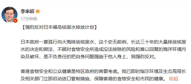 李家超:強(qiáng)烈反對(duì)日本福島核廢水排放計(jì)劃 立即啟動(dòng)進(jìn)口管制措施