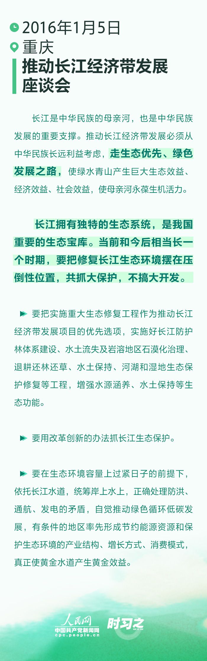 黨的十八大以來,習(xí)近平總書記先后四次主持召開座談會(huì),強(qiáng)調(diào)“堅(jiān)持共抓大保護(hù)、不搞大開發(fā),堅(jiān)持生態(tài)優(yōu)先、綠色發(fā)展”作為重中之重,為推動(dòng)長(zhǎng)江經(jīng)濟(jì)帶高質(zhì)量發(fā)展謀篇布局。