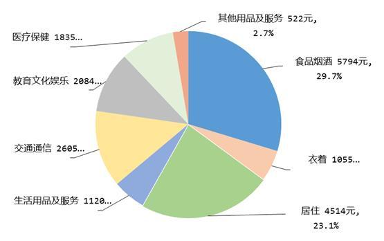 前三季度,全國居民人均食品煙酒消費支出5794元,增長6.7%,占人均消費支出的比重為29.7%;人均衣著消費支出1055元,增長6.5%,占人均消費支出的比重為5.4%;人均居住消費支出4514元,增長6.4%,占人均消費支出的比重為23.1%;人均生活用品及服務消費支出1120元,增長7.4%,占人均消費支出的比重為5.7%;人均交通通信消費支出2605元,增長11.3%,占人均消費支出的比重為13.3%;人均教育文化娛樂消費支出2084元,增長16.4%,占人均消費支出的比重為10.7%;人均醫(yī)療保健消費支出1835元,增長15.0%,占人均消費支出的比重為9.4%;人均其他用品及服務消費支出522元,增長17.4%,占人均消費支出的比重為2.7%。