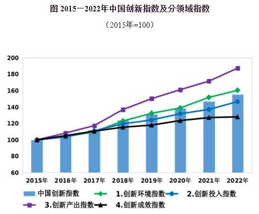 測(cè)算結(jié)果顯示,以2015年為基期,2022年中國(guó)創(chuàng)新指數(shù)為155.7,4個(gè)分領(lǐng)域指數(shù)創(chuàng)新環(huán)境指數(shù)、創(chuàng)新投入指數(shù)、創(chuàng)新產(chǎn)出指數(shù)和創(chuàng)新成效指數(shù)分別為160.4、146.7、187.5和128.2。與2015年相比,中國(guó)創(chuàng)新指數(shù)年均增長(zhǎng)6.5%,比同期國(guó)內(nèi)生產(chǎn)總值(GDP)增速快0.8個(gè)百分點(diǎn);4個(gè)分領(lǐng)域指數(shù)年均增速分別為7.0%、5.6%、9.4%和3.6%。與2021年相比,中國(guó)創(chuàng)新指數(shù)增長(zhǎng)5.9%,4個(gè)分領(lǐng)域指數(shù)分別增長(zhǎng)5.7%、7.0%、9.2%和0.7%。