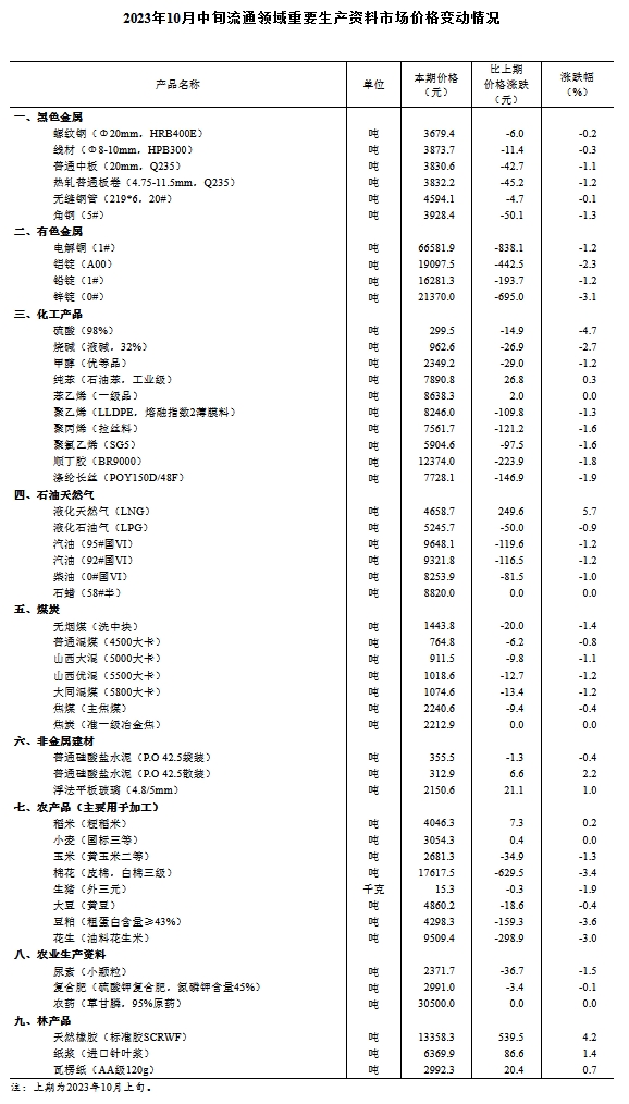 中新網(wǎng)10月24日電 國家統(tǒng)計(jì)局網(wǎng)站發(fā)布2023年10月中旬流通領(lǐng)域重要生產(chǎn)資料市場(chǎng)價(jià)格變動(dòng)情況。2023年10月中旬與10月上旬相比,8種產(chǎn)品價(jià)格上漲,37種下降,5種持平。其中液化天然氣(LNG)價(jià)格環(huán)比漲5.7%,天然橡膠(標(biāo)準(zhǔn)膠SCRWF)價(jià)格環(huán)比漲4.2%,棉花價(jià)格環(huán)比跌3.4%,生豬(外三元)價(jià)格環(huán)比跌1.9%。(中新財(cái)經(jīng))