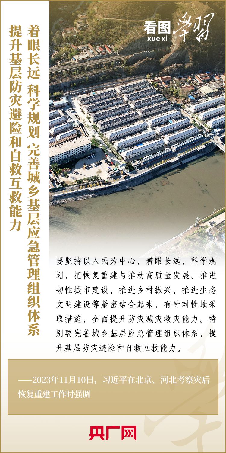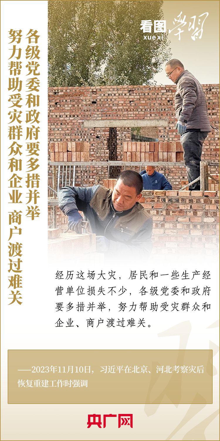 11月10日,習(xí)近平總書記在北京、河北考察災(zāi)后恢復(fù)重建工作??倳浬钊雽W(xué)校、社區(qū)、村莊、水利工程工地,實(shí)地察看村容村貌,了解基礎(chǔ)設(shè)施恢復(fù)建設(shè)提升等情況,要求有關(guān)部門堅(jiān)持以人民為中心,堅(jiān)持系統(tǒng)觀念,著眼長(zhǎng)遠(yuǎn)、科學(xué)規(guī)劃,把恢復(fù)重建與推動(dòng)高質(zhì)量發(fā)展、推進(jìn)韌性城市建設(shè)、推進(jìn)鄉(xiāng)村振興、推進(jìn)生態(tài)文明建設(shè)等緊密結(jié)合起來,有針對(duì)性地采取措施,再接再厲抓好災(zāi)后恢復(fù)重建,確保廣大人民群眾安居樂業(yè)、溫暖過冬。