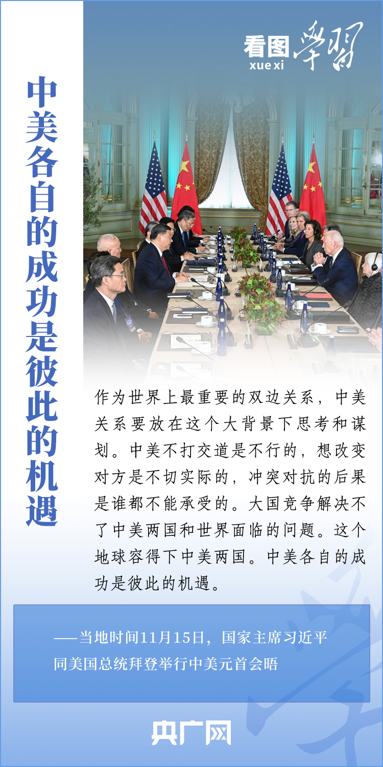 當(dāng)?shù)貢r(shí)間11月15日,國(guó)家主席習(xí)近平在美國(guó)舊金山斐洛里莊園同美國(guó)總統(tǒng)拜登舉行中美元首會(huì)晤。兩國(guó)元首就事關(guān)中美關(guān)系的戰(zhàn)略性、全局性、方向性問(wèn)題以及事關(guān)世界和平和發(fā)展的重大問(wèn)題坦誠(chéng)深入地交換了意見(jiàn)。習(xí)近平主席指出,大國(guó)競(jìng)爭(zhēng)解決不了中美兩國(guó)和世界面臨的問(wèn)題。這個(gè)地球容得下中美兩國(guó)。中美各自的成功是彼此的機(jī)遇。一起來(lái)學(xué)習(xí)!