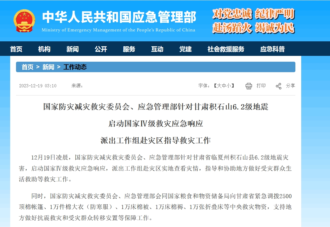 中新網(wǎng)12月19日電 據(jù)應急管理部網(wǎng)站消息,12月19日凌晨,國家防災減災救災委員會、應急管理部針對甘肅省臨夏州積石山縣6.2級地震災害,啟動國家Ⅳ級救災應急響應,派出工作組赴災區(qū)實地查看災情,指導和協(xié)助地方做好受災群眾生活救助等救災工作。