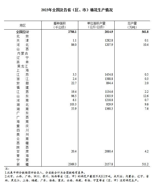 國家統(tǒng)計(jì)局:2023年全國棉花總產(chǎn)量561.8萬噸