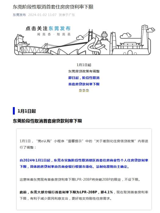 中新網(wǎng)1月2日電 據(jù)“東莞發(fā)布”微信公眾號消息,自2024年1月1日起,廣東省東莞市實(shí)施階段性取消轄區(qū)首套住房商業(yè)性個人住房貸款利率下限,具體的房貸利率由各商業(yè)銀行根據(jù)市場化、法制化原則自主確定。這意味著東莞現(xiàn)有首套房貸利率下限LPR-20BP將突破20BP的限定,不設(shè)下限。