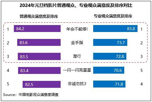 中國電影觀眾滿意度調(diào)查 2024年元旦檔調(diào)查結(jié)果顯示,元旦檔電影觀眾滿意度得分83.0分,環(huán)比增長0.2分。檔期以多元化且高契合度的影片供給陪伴觀眾跨年,得到了較高的滿意度評價(jià),5部影片中有4部進(jìn)入歷史調(diào)查19部元旦檔影片的滿意度前十,喜劇《年會(huì)不能停!》以84.2分領(lǐng)銜,《金手指》83.0分居第二位,《潛行》《一閃一閃亮星星》均超82分,《非誠勿擾3》超81分。