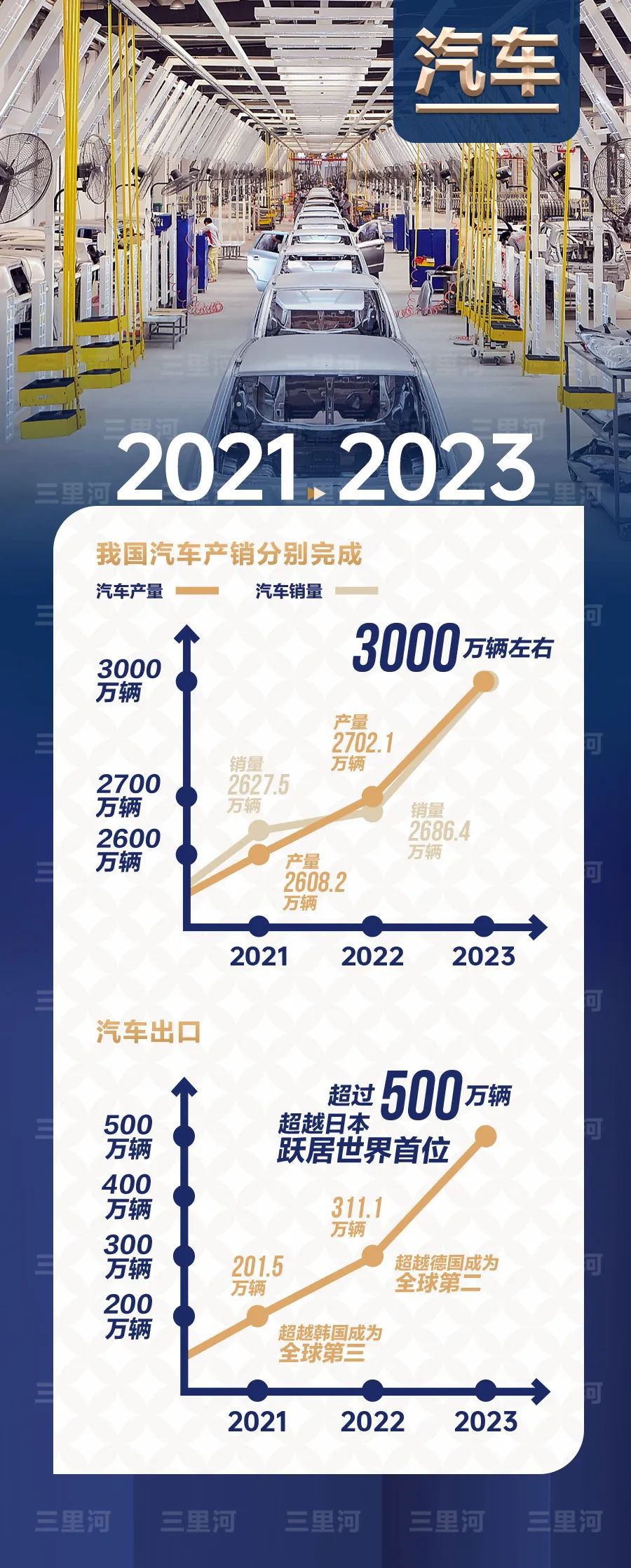 2023年,全年汽車產(chǎn)銷量預計達3000萬輛左右、創(chuàng)歷史新高,出口超過500萬輛,超越日本,躍居世界首位。
