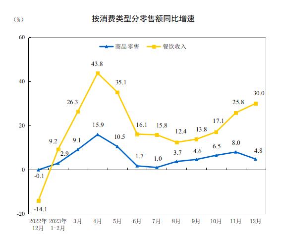 按消費(fèi)類(lèi)型分,12月份,商品零售38145億元,同比增長(zhǎng)4.8%;餐飲收入5405億元,增長(zhǎng)30.0%。2023年,商品零售418605億元,比上年增長(zhǎng)5.8%;餐飲收入52890億元,增長(zhǎng)20.4%。