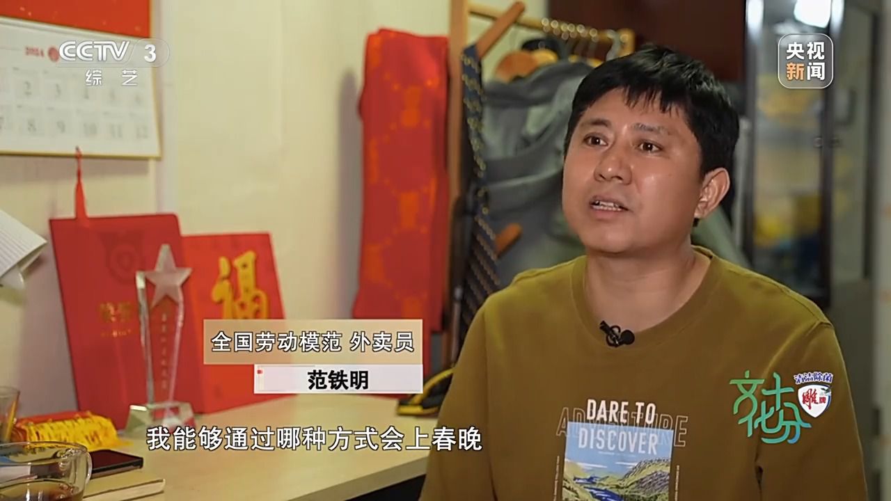 全國勞動(dòng)模范 外賣員 范鐵明:2023年,我被評(píng)為全國最美外賣配送員,這個(gè)獎(jiǎng)項(xiàng),不單純是給我個(gè)人的,實(shí)際上是對(duì)新就業(yè)群體,對(duì)騎手的一個(gè)認(rèn)可。根本就沒有想到我能夠通過哪種方式會(huì)上春晚,因?yàn)槲矣植皇菍I(yè)的演職人員,當(dāng)時(shí)我并不是很相信,我們分配的是《勞動(dòng)最光榮》,它是一個(gè)通過動(dòng)畫片的形式,就是我們兒時(shí)都會(huì)看一些動(dòng)畫片,動(dòng)畫片里都會(huì)有一些主人公,比如說《黑貓警長(zhǎng)》當(dāng)中的黑貓警長(zhǎng),《大鬧天宮》里的孫悟空,包括《小貓釣魚》里頭的貓媽媽,當(dāng)然都是我們當(dāng)時(shí)崇拜的一個(gè)對(duì)象,最終我們成為或即將成為他們。
