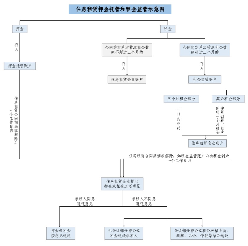 《北京市住房租賃條例》第三十六條規(guī)定,住房租賃企業(yè)向承租人收取的押金應通過第三方專用賬戶托管,單次收取租金的數(shù)額超過三個月租金的,超收的租金應當納入監(jiān)管,并且明確住房租賃企業(yè)收取的押金由第三方專用賬戶托管?!墩髑笠庖姼濉穱栏衤鋵崱侗本┦凶》孔赓U條例》規(guī)定,進一步制定相關(guān)實施細則,明確賬戶主體,規(guī)范押金托管、租金監(jiān)管業(yè)務流程。