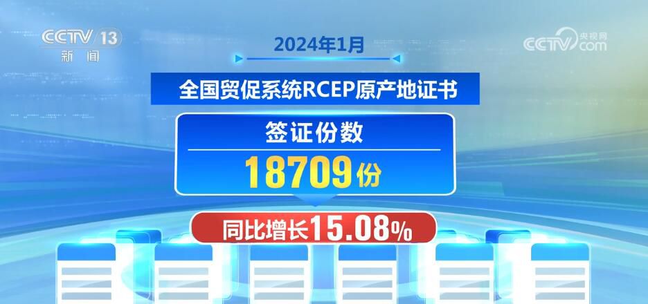2024年1月,全國貿(mào)促系統(tǒng)RCEP原產(chǎn)地證書簽證份數(shù)為18709份,同比增長15.08%;辦證企業(yè)3640家,同比增長10.40%,出口目的國包括日本、印尼、韓國、越南等13個成員國,預(yù)計共為我國產(chǎn)品在RCEP進口成員國減免關(guān)稅0.09億美元,RCEP的政策紅利在持續(xù)釋放。
