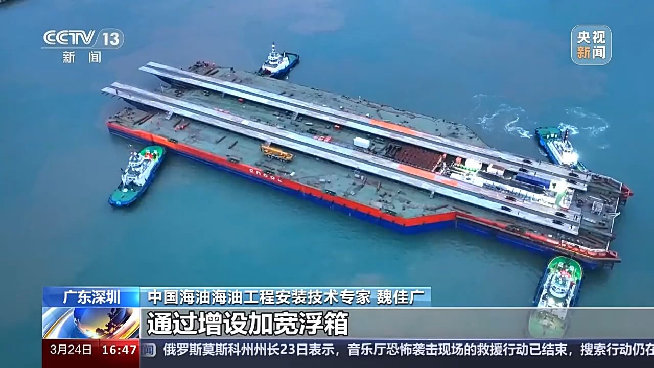 總臺央視記者 古峻嶺:這里是位于深圳東南方向240多公里處的流花油田海域,我們現(xiàn)在看到的這個大家伙,就是搭乘亞洲最大下水駁船——海洋石油229的?;柹詈Ч芗堋K喈斢诤I掀脚_穩(wěn)穩(wěn)矗立在海底的“大長腿”,用鋼量接近于一整個“鳥巢”國家體育館。它是從廣東珠海出發(fā),經(jīng)過40多個小時的長距離拖航,剛剛抵達這一片施工海域。目前正在進行海上安裝前最后的準備工作。