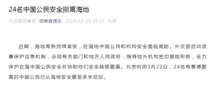 中新網(wǎng)3月25日電 據(jù)外交部領(lǐng)事司微信公眾號“領(lǐng)事直通車”25日消息,近期,海地局勢持續(xù)緊張,在海地中國公民和機(jī)構(gòu)安全面臨威脅。外交部啟動領(lǐng)事保護(hù)應(yīng)急機(jī)制,會同有關(guān)部門和地方人民政府,指導(dǎo)駐外機(jī)構(gòu)密切跟蹤形勢,全力保護(hù)在海中國公民安全并協(xié)助他們安全轉(zhuǎn)移撤離。北京時(shí)間3月22日,24名有意愿撤離的中國公民已從海地安全撤至多米尼加。