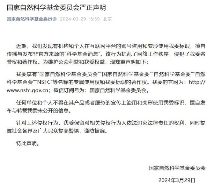 為維護(hù)公眾利益和國家自然科學(xué)基金委員會(huì)權(quán)益,國家自然科學(xué)基金委員會(huì)鄭重聲明如下: