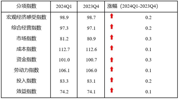 分項指數(shù)全面上升。一季度,宏觀經濟感受指數(shù)、綜合經營指數(shù)、市場指數(shù)、成本指數(shù)、資金指數(shù)、勞動力指數(shù)、投入指數(shù)和效益指數(shù)均止跌回升,環(huán)比分別上升0.2、0.2、0.3、0.1、0.3、0.1、0.2和0.1點。資金指數(shù)和勞動力指數(shù)處于景氣臨界值100以上,宏觀經濟感受指數(shù)、綜合經營指數(shù)、市場指數(shù)、投入指數(shù)和效益指數(shù)均處于景氣臨界值100以下,效益指數(shù)一直處于最低位。