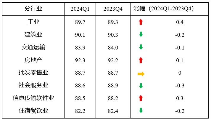 分行業(yè)指數(shù)3升1平4降。一季度,工業(yè)、房地產業(yè)和信息傳輸計算機服務軟件業(yè)指數(shù)比上季度分別上升0.4、0.1和0.3點,批發(fā)零售業(yè)指數(shù)持平,建筑業(yè)、交通運輸郵政倉儲業(yè)、社會服務業(yè)和住宿餐飲業(yè)指數(shù)比上季度分別下降0.2、0.1、0.3和0.2點,社會服務業(yè)指數(shù)降幅較大。8個分行業(yè)指數(shù)均處于景氣臨界值100以下。