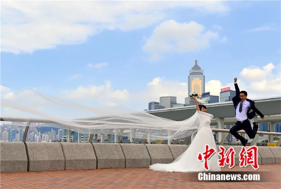 年輕情侶在中環(huán)碼頭拍攝婚紗照。中新社記者 張煒 攝