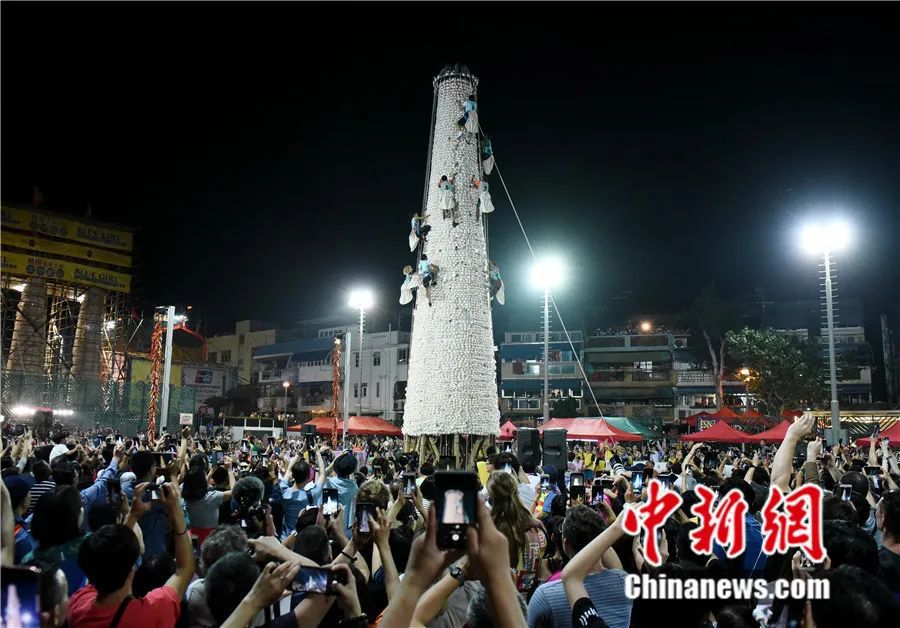 太平清醮另一焦點(diǎn)活動(dòng)是在凌晨舉行的搶包山比賽。一般相信,包子掛得越高,搶得越多,福氣就會(huì)倍增。
