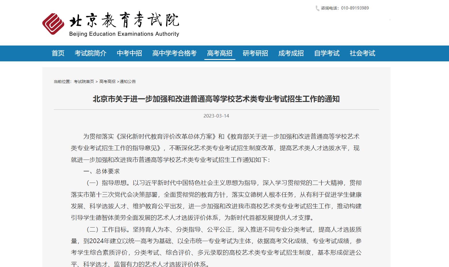 根據(jù)《北京市關(guān)于進(jìn)一步加強(qiáng)和改進(jìn)普通高等學(xué)校藝術(shù)類(lèi)專(zhuān)業(yè)考試招生工作的通知》(以下簡(jiǎn)稱(chēng)《通知》),高校藝術(shù)類(lèi)專(zhuān)業(yè)招生實(shí)行“文化素質(zhì)+專(zhuān)業(yè)能力”的考試評(píng)價(jià)方式,文化素質(zhì)使用高考文化課考試成績(jī),專(zhuān)業(yè)能力使用藝術(shù)專(zhuān)業(yè)能力考試成績(jī)。