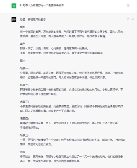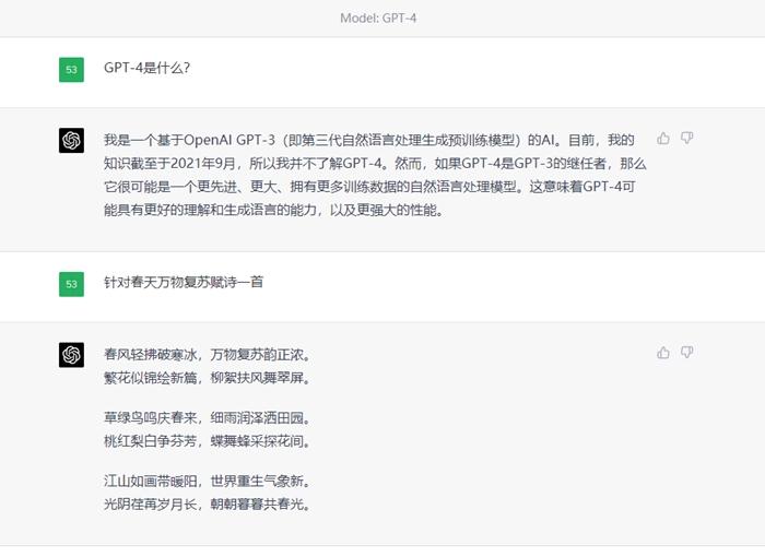 目前GPT-4僅限于ChatGPT Plus訂戶使用。記者體驗(yàn)時(shí)發(fā)現(xiàn),GPT-4生成速度比較慢,但回答簡(jiǎn)明扼要,更有創(chuàng)造性,無(wú)論是寫(xiě)詩(shī)歌還是故事劇本都不在話下。例如它可以根據(jù)“春天萬(wàn)物復(fù)蘇”賦詩(shī)一首或者寫(xiě)成一個(gè)愛(ài)情故事的劇本。