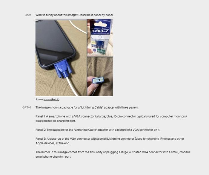不過(guò)據(jù)OpenAI介紹,在輸入一張畫(huà)有VGA線連接手機(jī)充電接口內(nèi)容的圖像后,GPT-4除了能描述出這幅圖中的內(nèi)容,還能指出這張圖有哪些不對(duì)勁,“這幅圖中的幽默來(lái)自于將一個(gè)大的過(guò)時(shí)的VGA連接器插入一個(gè)小的現(xiàn)代化的智能手機(jī)充電端口?!?/p>