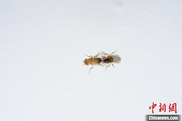 暴露在濃度略微升高的臭氧(100ppb)中15分鐘后的2只雄性果蠅開始嘗試交配。 Benjamin Fabian 攝