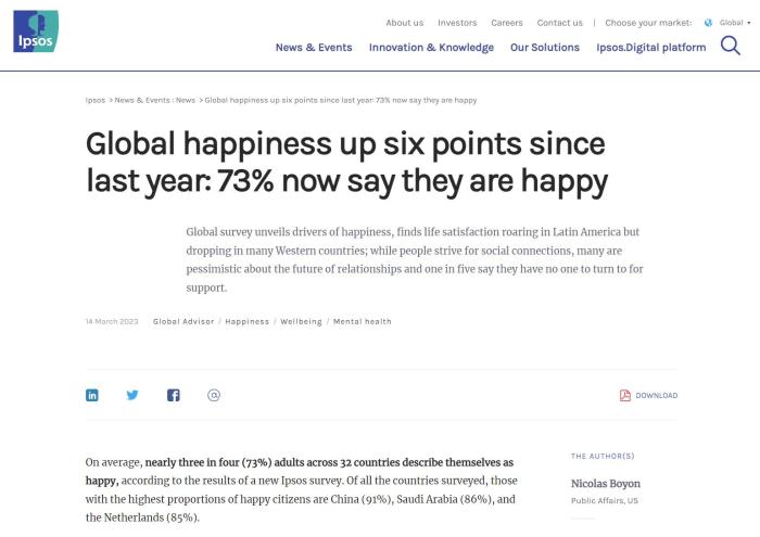 調查結果顯示,平均而言,在32個國家中,近四分之三(73%)的成年人認為自己很幸福。在所有接受調查的國家中,幸福感指數(shù)最高的國家是中國(91%),其后是沙特阿拉伯(86%)、荷蘭(85%)、印度(84%)、巴西(83%)。